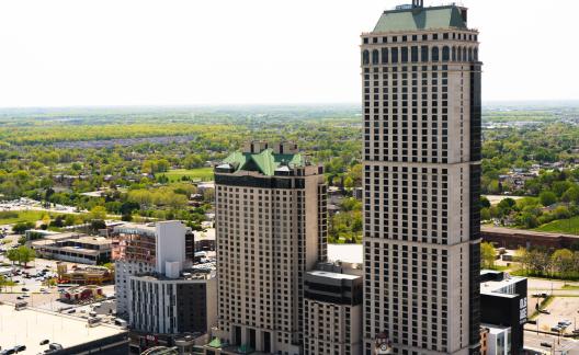 Located at 5200 Robinson St, the Skylon Tower has a fairly large parking lot that also allows for overnight parking and bus parking.